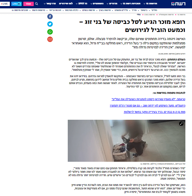האישה זיהתה בדירה תחתונים שאינם שלה, וביקשה להיפרד מבעלה. אולם, סרטון ממצלמות שהותקנו במקום גילה כי בעל הדירה, ראש מחלקה בבי"ח גדול, הוא שאחראי למעשה. "אין חדירה לפרטיות גדולה מזו"